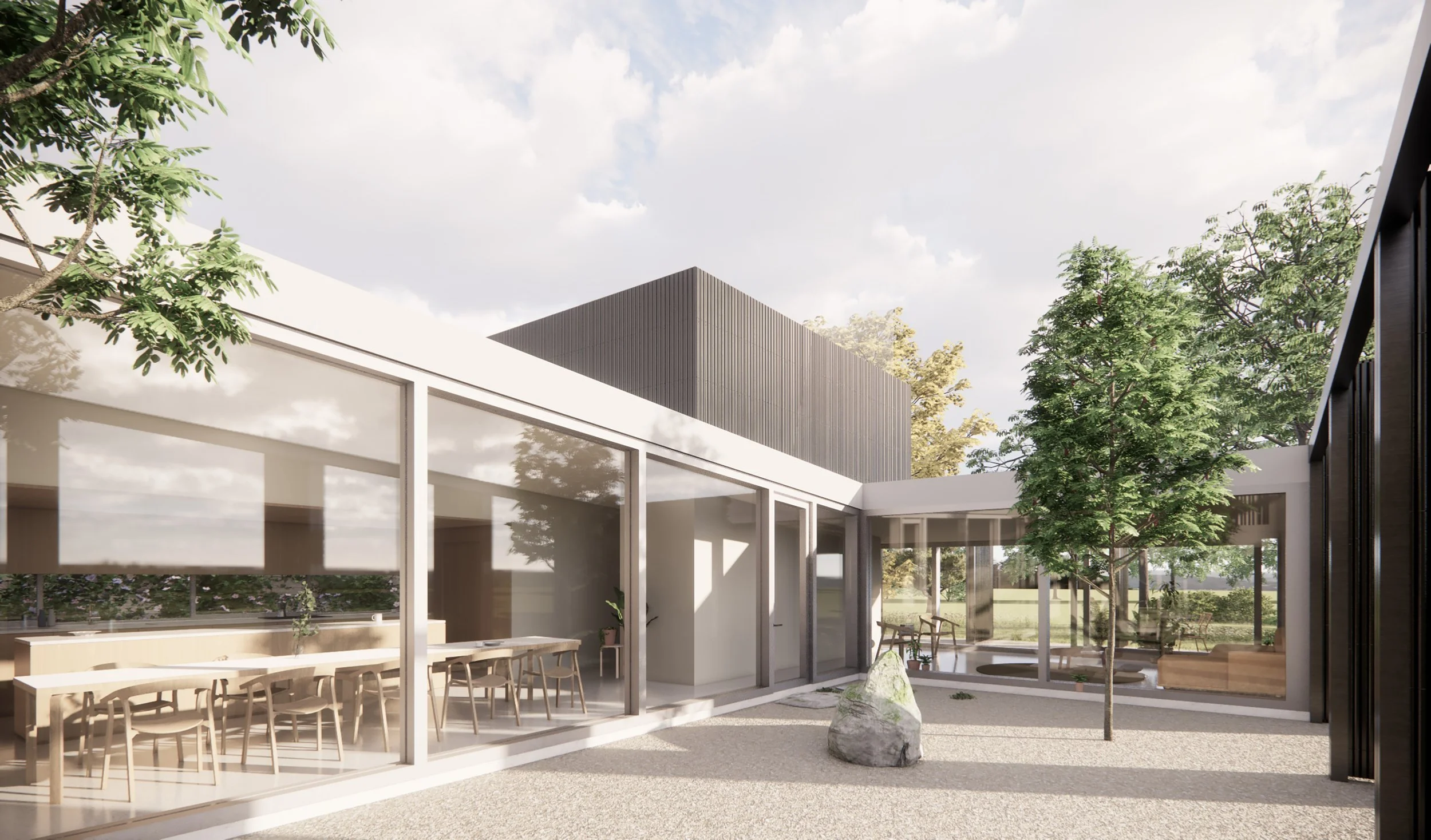 The site sits at the edge of the city center, bordering a historic park, a river, and a native forest reservation with 600-year-old trees. Spearheading post-pandemic transformations in the well-connected suburb, we propose a new type of house that accommodates diverse work/live arrangements and lifestyles.